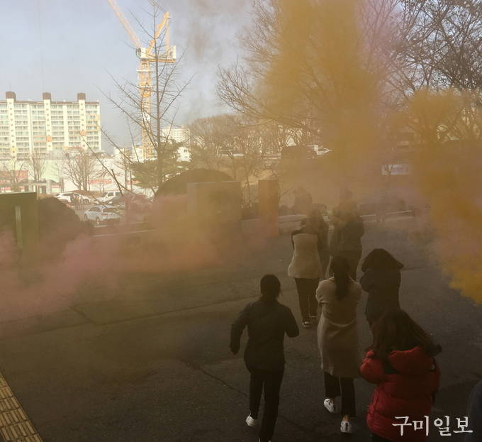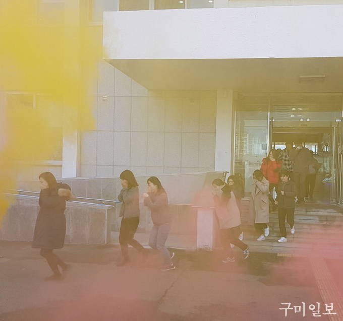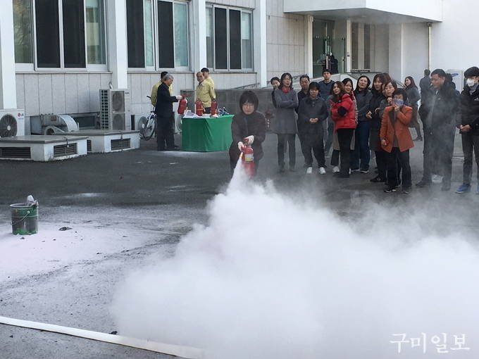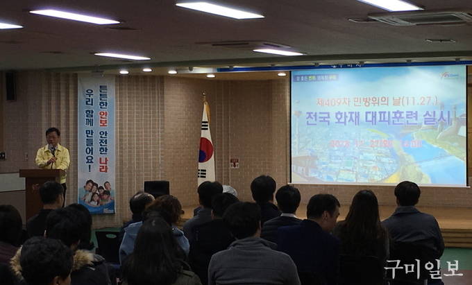 구미시(시장 장세용)에서는 지난 11월 27일(화) 오후 2시 제409차 민방위의 날을 맞이하여 구미소방서의 지원을 받아 구미시청 직원과 민원인 150여 명을 대상으로 화재 시 국민행동요령 및 소화기 사용법을 교육하고, 실제 대피훈련을 실시하였다.