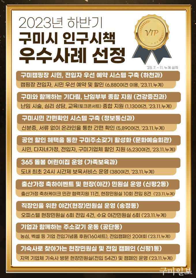 구미시는 인구 위기를 극복하고 살고 싶은 구미 조성에 기여한 「2023 하반기 인구증가 시책 우수 사례」를 선정했다.