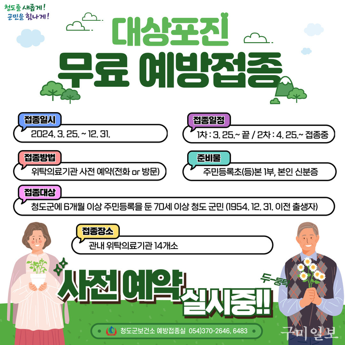 청도군 보건소에서는 지역사회의 건강을 책임지고, 주민의 안녕을 위해 대상포진 무료 예방접종을 시행하고 있다.