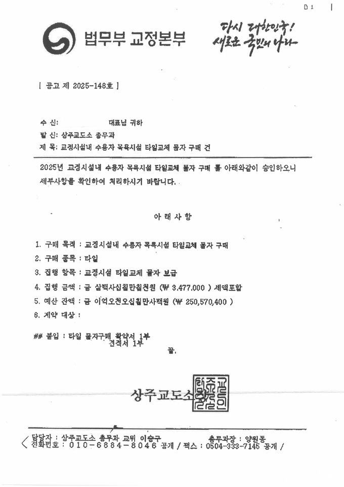 송재열 소장은 “최근 교정공무원 사칭 사기는 업종을 가리지 않고 사기수법도 다양해지고 있어, 소상공인들의 각별한 주의가 필요하다. 교정기관은 사전에 협의 없이 공문을 보내 대리구매나 금전대납 등을 요구하지 않으니, 혹시나 의심스러운 주문이나 요청이 있는 경우 상주교도소(054-531-4100)로 전화하여 진위여부를 꼭 확인 부탁드린다.” 고 당부하였다.