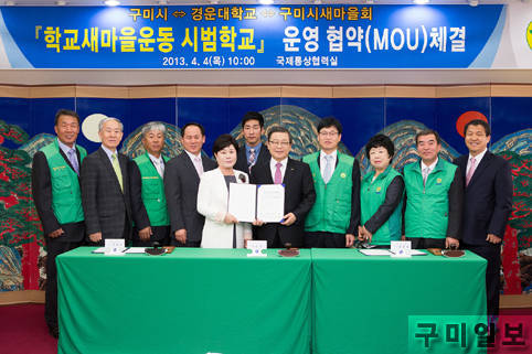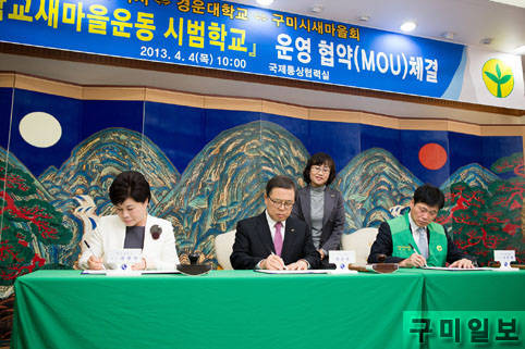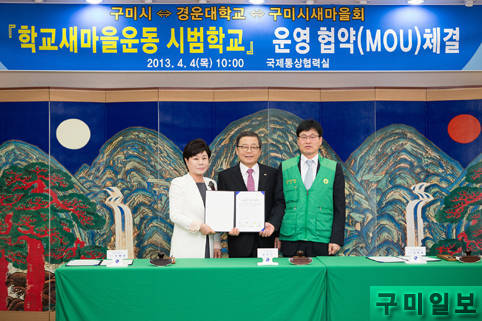 구미시(시장 남유진)는 청소년들에게 새마을운동의 올바른 이해와 그 가치의 중요성을 전파하기 위하여 구미시와 경운대학교(총장 김향자), 구미시새마을회(회장 김봉재)는 4월 4일(목) 오전 구미시청 국제통상협력실에서 새마을운동 시범학교운영 협약식을 체결했다.