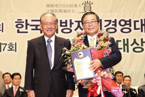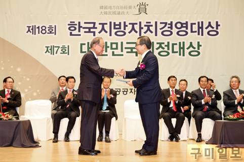 남유진 구미시장은 9월 10일(화) 오후 2시 고양시 킨텍스 그랜드 볼룸에서 1,400여명이 참석한 가운데 (사)한국공공자치연구원(이사장 박우서)이 주최하는 제18회 한국지방자치경영대상 시상식에서 자치단체장으로서는 최고의 상인 ‘최고경영자상’을 수상했다.