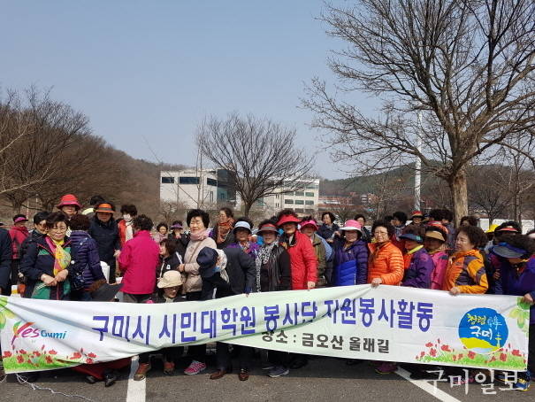 구미시평생교육원(원장 김구연)에서는 2017. 3. 21(화) 구미시 시민대학원 봉사단(단장 권영희) 회원 110여명이 참여한 가운데 금오산도립공원 대주차장 및 올레길 일원에서 자연보호 봉사활동을 가졌다.