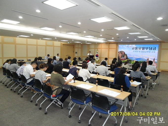 구미시(시장 남유진)는 지난 2017. 8. 4(금) 시청 3층 상황실에서 2017년도 교통유발부담금 부과대상 시설물에 대한 본격적인 조사를 시작하기 전 현장조사요원 등 40여명이 참석한 가운데 교통유발부담금 부과에 대한 지침시달 회의를 실시하였다.