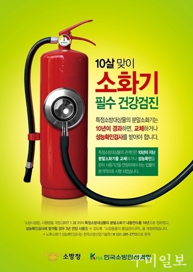 '화재예방, 소방시설 설치,유지 및 안전관리에 관한 법률' 및 같은 법 시행령이 개정됨에 따라 생산된지 10년이 지난 분말소화기는 새것으로 교체하거나 성능확인을 받아 사용기간을 3년 연장해야 한다.