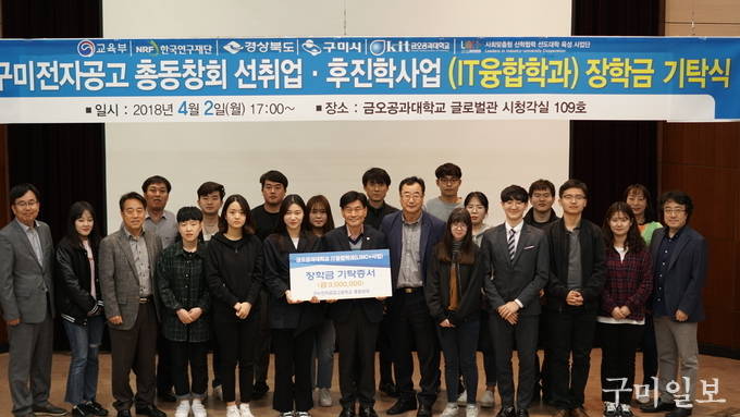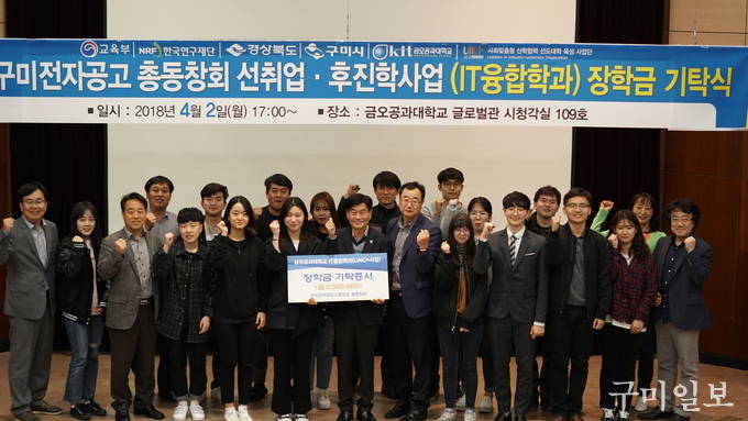 지난 4월 2일(월) 글로벌관 시청각실에서 열린 장학금 기탁식은 구미전자공고를 졸업하고 금오공대 IT융합학과에 입학한 학생들을 위해 마련됐다. 구미전자공고 총동창회는 산업체 재직자 전형의 IT융합학과 신·편입생들에게 일과 학습을 병행하며 열심히 공부하는 학생들을 격려하고, 모교의 자긍심을 고취시키기 위해 매년 3백만 원의 장학금을 4년째 후원하고 있다. 올해는 신입생 8명과 편입생 2명 등 총 10명에게 장학금을 전달했다.