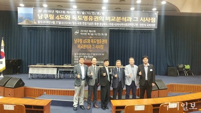 이번 포럼에서 남쿠릴 열도와 독도에 대해 ▶ 홍성근 동북아역사재단 연구위원이 ‘문제 근원의 역사적 배경’▶ 서인원 일제강제동원 피해자지원재단 팀장이 ‘전후 영토처리과정 비교분석’▶ 이동원 선문대 연구교수가 ‘조약법상 해석 비교’▶ 김영기 독도조사연구학회장이 ‘남쿠릴 열도가 독도에 주는 국제법적 시사점’이라는 논제로 각각 주제발표를 했다.