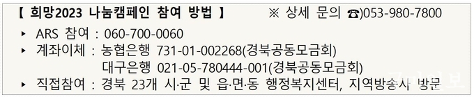 경북사회복지공동모금회는 ‘희망 2023 나눔캠페인’ 기간 언론사 방송모금, 거리홍보캠페인 모금, 금융기관 모금, 학교 모금, ARS모금(060-700-0060) 등 다양한 나눔 참여방법을 마련하고 도민의 따뜻한 손길을 기다린다.