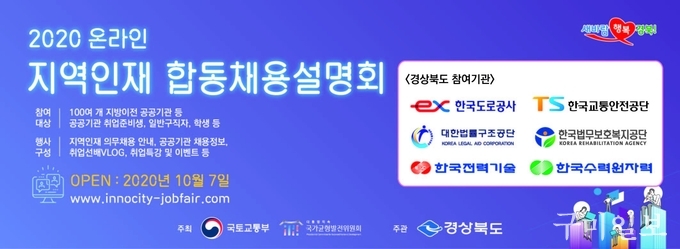 경상북도는 이전공공기관의 지역인재 채용 확대와 취업촉진을 위해 10월 7일(수)부터 11월 30일(월)까지 ‘2020년 온라인 지역인재 합동채용설명회’를 국토교통부, 국가균형발전위원회와 함께 개최한다.