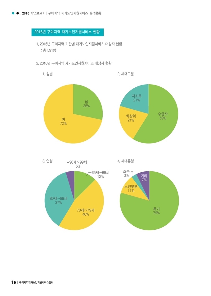 2016년 구미지역 기관별 재가노인 지원서비스 대상자 현황은 총591명에 대해 서비스를 실시하였으며, 대상자별 현황은 그림과 같다.