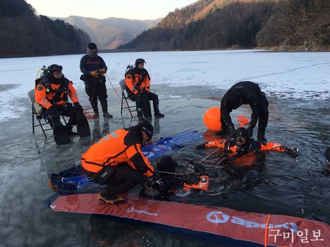 훈련은 겨울철 수중 환경에 따른 인체생리적 영향, 동계잠수 활동절차, 빙상구조론 등 이론교육을 시작으로 건식잠수복 사용법, 얼음 하부 유영, 수중 수색법, 실제상황 설정 종합구조 훈련 실기평가 등 실기실습 순으로 진행됐다.