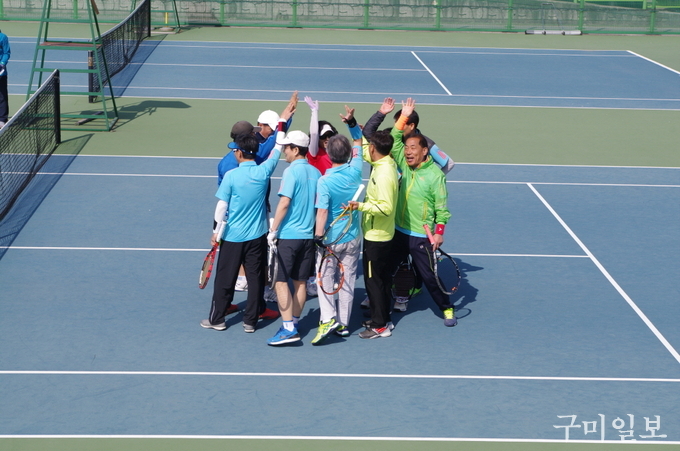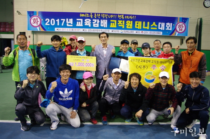 구미교육지원청(교육장 노승하) 교직원테니스선수단은 지난 4.22(토) 김천 스포츠타운 테니스장에서 개최된 ‘2017년 경상북도교육감배 교직원테니스대회’시부에서 우승의 영광을 차지하였다.