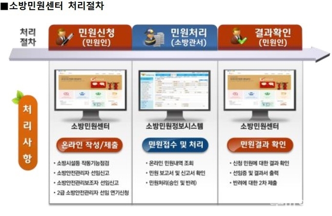 지난해 7월부터 운영하고 있는 온라인 '소방민원사이트'는 민원인이 직접 소방서에 오지 않고 인터넷을 통해 소방시설 등 작동기능점검 결과보고서와 소방안전관리자 선임, 선임 연기 신고 등 소방 관련 민원을 처리할 수 있도록 국민안전처에서 시스템을 구축해 전국적으로 운영하고 있다.