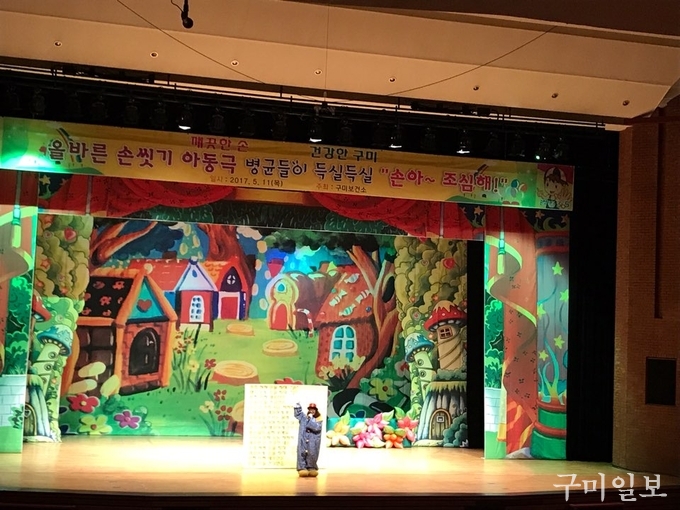 구미시(시장 남유진)는 지난 5월 11일(목) 구미문화예술회관 대공연장에서 유치원 23개소 아동 1,504명을 대상으로 인형극 전문극단을 초청하여 ‘올바른 손씻기 인형극’을 오전, 오후 2회에 걸쳐 공연을 실시하였다.