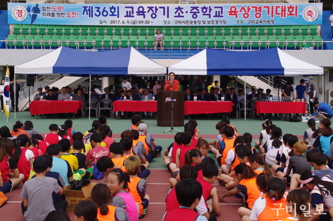 구미교육지원청(교육장 노승하)은 지난 6월 9일(금) 구미 시민운동장에서 육상 꿈나무들이 한자리에 모여 “힘찬 도약! 미래를 향한 도전!”이라는 슬로건 아래 제36회 교육장기 초·중학교육상경기대회를 개최했다.