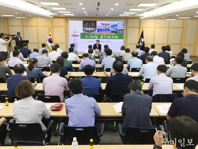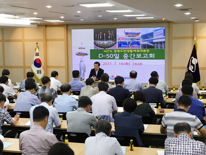 구미시(시장 남유진)는 7. 18(화) 16:00 시청 3층 상황실에서 전부서 주무계장 등 80여명이 참석한 가운데 「제27회 경북도민생활체육대축전」 D-50일 중간보고회를 개최하고, 성공적인 대축전을 위하여 분야별 추진상황 중간 점검에 들어갔다.