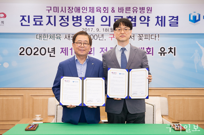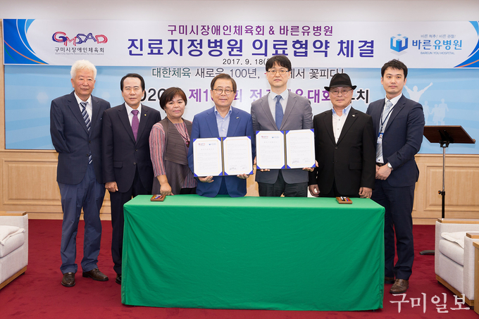 구미시장애인체육회(회장 남유진)와 바른유병원(원장 유영상)은 9월 18일(월) 시청 국제통상협력실에서 『진료지정병원 의료협약』을 체결하였다.