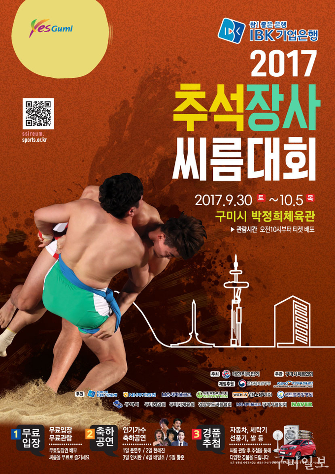 구미시(시장 남유진) 박정희체육관에서 사상 최장의 10일간의 긴 연휴 시작일에 2017 추석장사씨름대회가(9.30 ~ 10.5, 6일간) 개최된다.