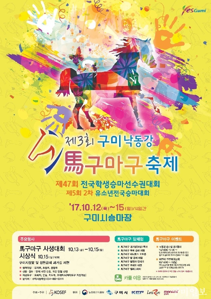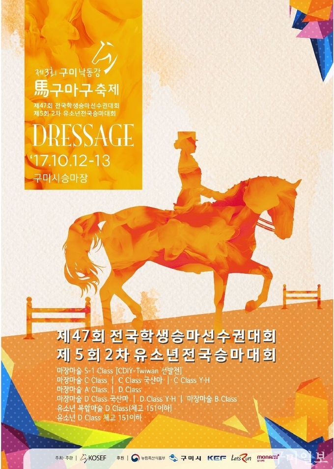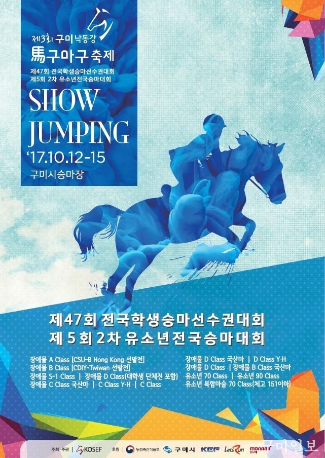 구미시(시장 남유진)와 한국학생승마협회(회장 최병욱) 주최로 오는 10월 12일부터 15일까지 나흘간의 일정으로 ‘제47회 학생승마선수권대회 겸 제5회 유소년전국승마대회와 시민참여행사인 제3회 구미낙동강 馬구마구 축제’ 가 구미시승마장에서 열린다.