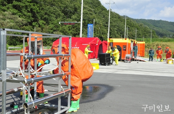 이번 훈련은 구미시, 구미화학재난합동방재센터 등이 주관하고 민·관·군·경 등 28개 기관, 350여명이 참여하여 화재확산 방지, 유해화학물질 누출 시 신속한 인명대피와 구조, 누출차단, 인체·장비·지역 제독활동, 현장 복구 등의 순으로 진행된다.