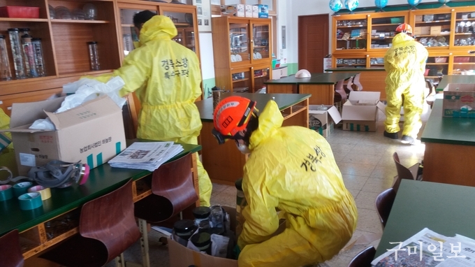 지난 16일(목) 11시18분경 포항시 장성초등학교에서 인체에 독성이 강한 물질로 알려진 포르말린이 유출되었다는 신고를 받고 구미 화학구조대가 현장에 즉시 출동하여 포르말린을 안전하게 수거하는 등 피해지역에 소방력을 근접 배치하여 신속한 조치가 되도록 하고 있다.