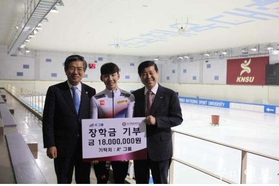 한편, 이날 장학금 전달식에는 A+그룹에서 곽근호 회장과 이종성 사장 등이 참석했고, 한국체대 김성조 총장을 비롯하여 전명규(빙상), 김진해(스키) 교수와 함께 빙상부 임효준(3학년) 학생이 참석했다.