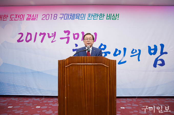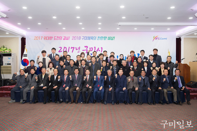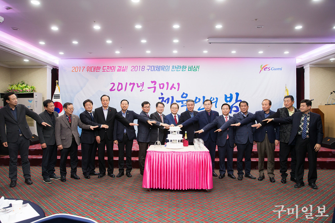 구미시체육회(회장 남유진 구미시장)는 지난 12월 7일(목) 구미웨딩 4층 대연회장에서 남유진 시장을 비롯한 시·도의원, 관내 기관단체장 등 체육인 800여명이 참석한 가운데 한 해를 되돌아보고 새해 힘찬 도약을 다짐하는 ‘2017 체육인의 밤 행사’를 성황리에 가졌다.