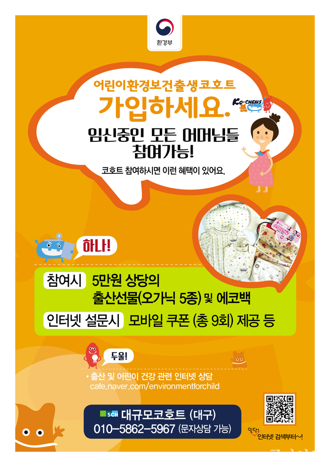 대구지역에서 환경부의 어린이 환경보건 출생코호트 참여를 희망하는 임신부는 한국패션센터로 방문 (B06부스, 행사장 2층)하거나, 환경보건센터로 문의(010-5862-5967)하면 된다.