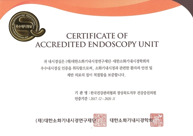 한국건강관리협회경상북도지부(본부장 이영하, 이하 건협 경북)가 (재)대한소화기내시경연구재단과 대한소화기내시경학회가 주관하는‘우수내시경실’인증을 획득했다.