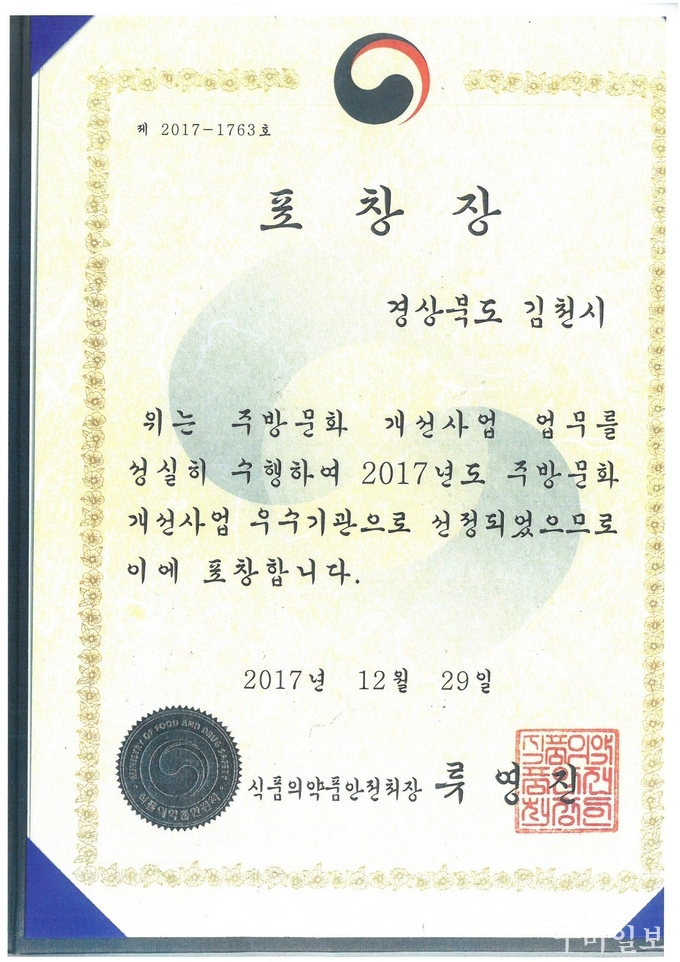 김천시(시장 박보생)는 작년 한해 음식문화개선 및 주방문화개선 사업을 혁신적으로 추진하여 2017년 주방문화개선 우수기관 수상(식품의약품안전처), 2017년 음식문화개선 최우수기관 수상(경상북도)등 우수한 성과를 달성하였고 올해에도 안전한 외식환경조성 및 건강한 식단실천으로 시민건강 증진을 도모하고자 음식문화개선 및 주방문화개선 사업을 도내 타 시·군보다 선도적으로 앞장서 추진할 방침이다.