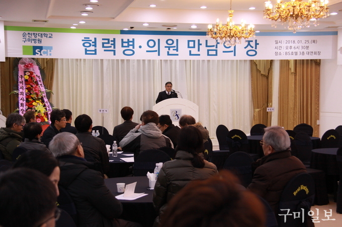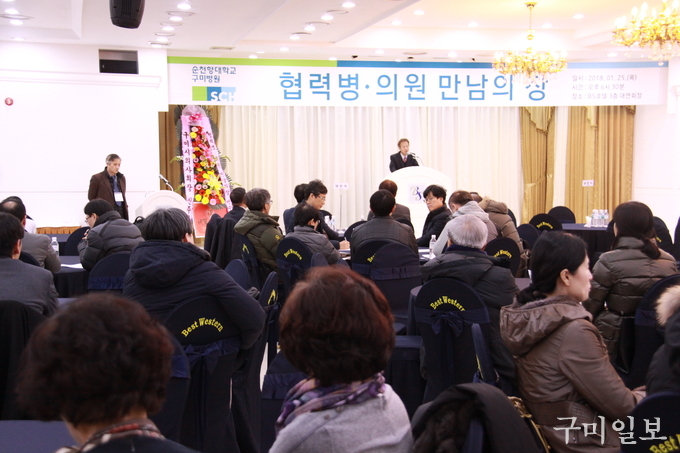 순천향대학교 부속 구미병원(병원장 임한혁)은 지난 1월 25일(목) 오후 7시부터 9시 30분까지 구미BS호텔 대연회장에서 2018년 협력 병·의원 간담회 및 개원의 연수강좌를 개최했다.
