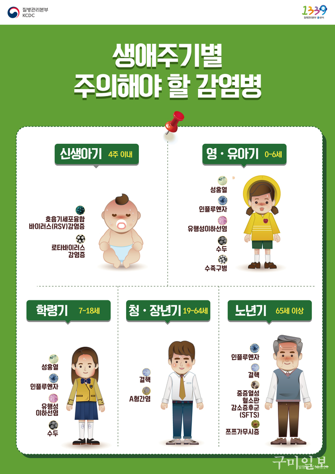 산후조리원, 신생아실 등에서 대부분을 보내는 신생아기(4주 이내)에는 로타바이러스, 단체생활이 증가하는 영유아기(0-6세)에는 수족구병과 인플루엔자, 학령기(7-18세)에는 유행성 이하선염, 수두, 성홍열, 인플루엔자, 청․장년기(19-64세)에는 체계적인 관리가 필요한 A형간염과 결핵, 나이가 들면서 면역력이 떨어지는 노년기(65세 이상)에는 진드기매개 질환과 결핵, 인플루엔자가 주의해야 할 감염병으로 선정되었다.