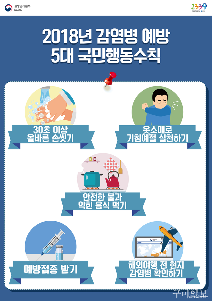 김천시(시장 박보생)는 2018년 질병관리본부에서 선정한 생애주기별 관리대상 감염병 예방과 관련해 시민들이 일상생활에서 실천할 수 있는 5대 국민행동수칙 준수를 당부했다.
