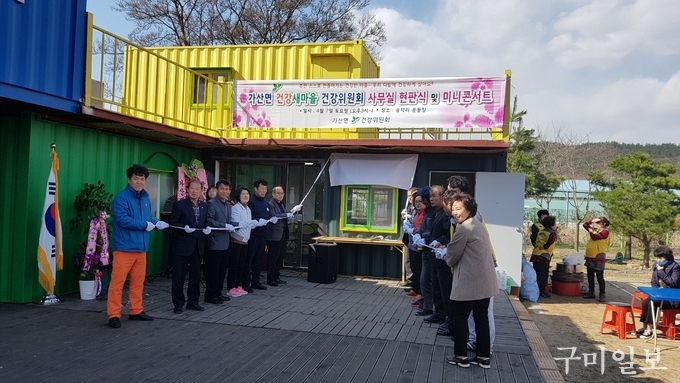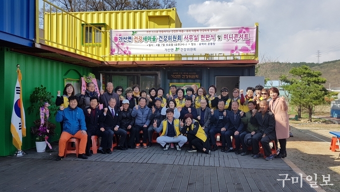 칠곡군 가산면 건강위원회는 지난 4월 6일(금) 가산면민 운동장에서 안진국 가산면 건강위원장을 비롯해 건강위원, 지역주민 등이 참여한 가운데 ‘건강위원회 사무실 현판식 및 미니음악회’를 개최했다.