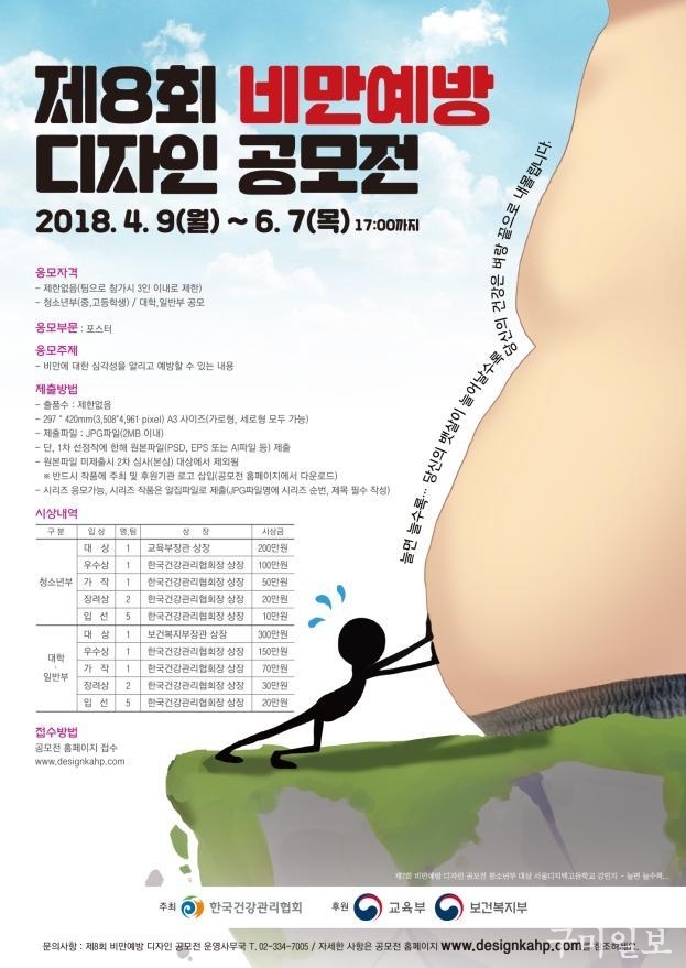 한국건강관리협회(회장 채종일, 이하 건협)가 교육부와 보건복지부의 후원으로 4월 9일(월) ~ 6월 7일(목)까지 “제8회 비만예방 디자인 공모전”을 개최한다.