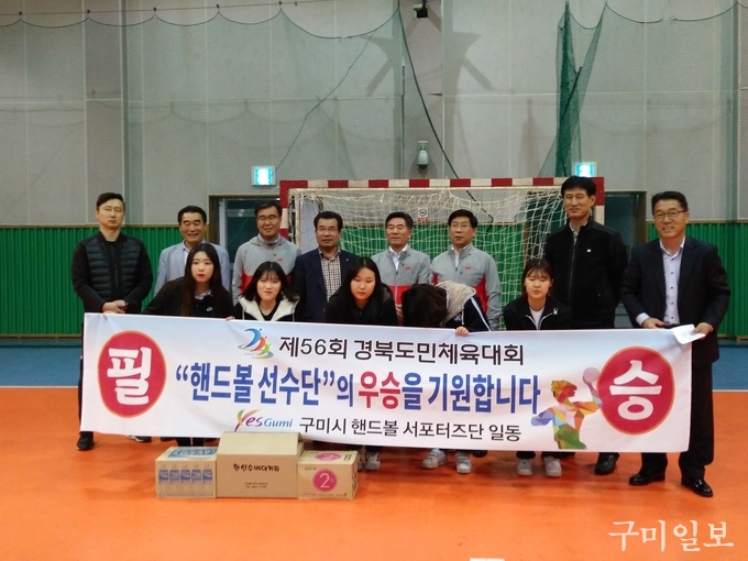 제56회 경북도민체전 구미시 핸드볼 서포터즈단은 지난 4월 23일(월) 18:00, 선산체육관을 방문하여 격려금과 간식을 전달하고, 우승을 위하여 구슬땀 흘리고 있는 선수단을 격려하였다.