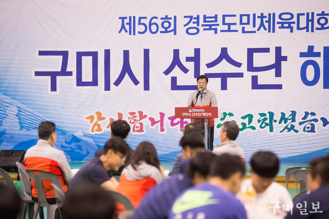 구미시(시장권한대행 부시장 이묵)는 5월 16일(수) 오후 5시 박정희체육관 주경기장 에서 국회의원, 도·시의원, 기관단체장, 서포터즈, 학교장, 체육회 임원 및 선수 등 700여명이 참석한 가운데 구미시체육회 주관으로「제56회 경북도민체육대회 구미시선수단 해단식」을 개최했다.