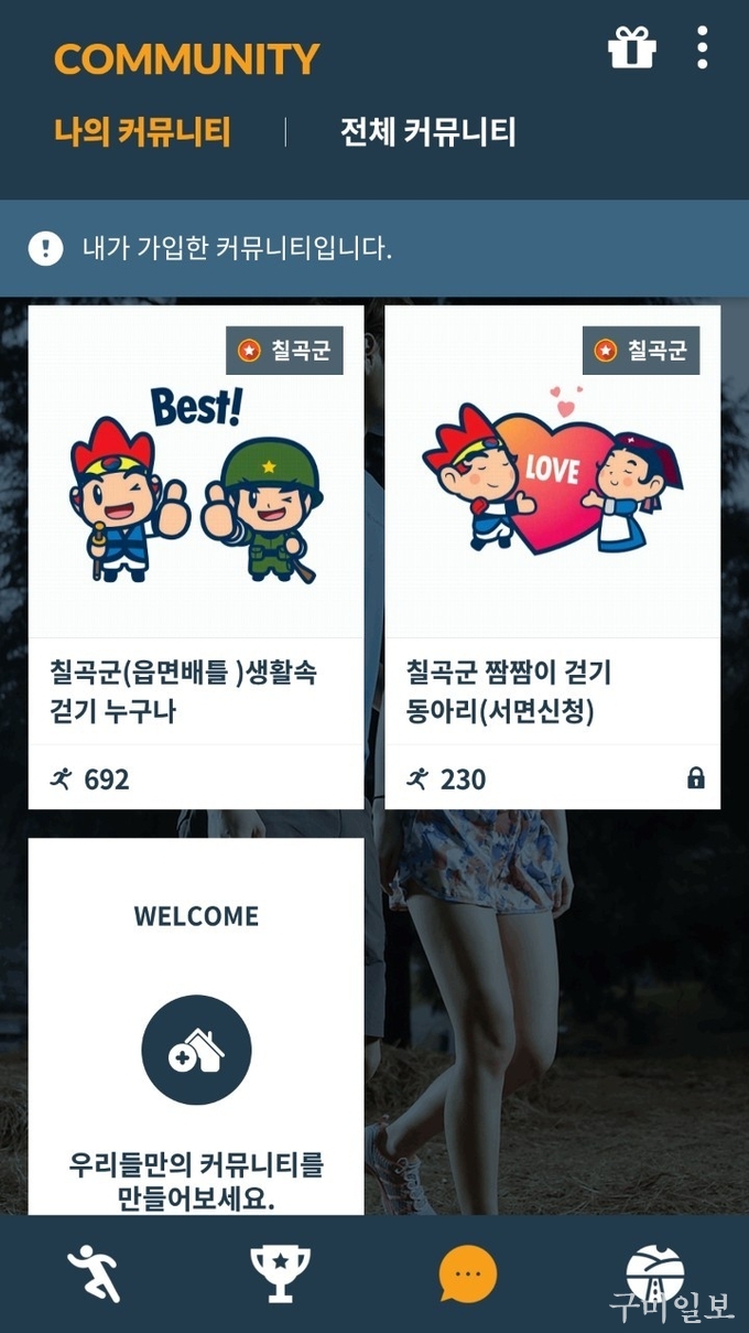 모바일 걷기 참여는 구글 플레이 스토어에 워크온을 검색하여 설치한 뒤 칠곡군 읍면배틀 커뮤니티에 가입하면 된다. 자세한 내용은 칠곡군보건소 홈페이지 공지사항에 ‘읍면 또는 짬짬이’로 검색하거나 건강관리담당 979-8212로 문의하면 된다.