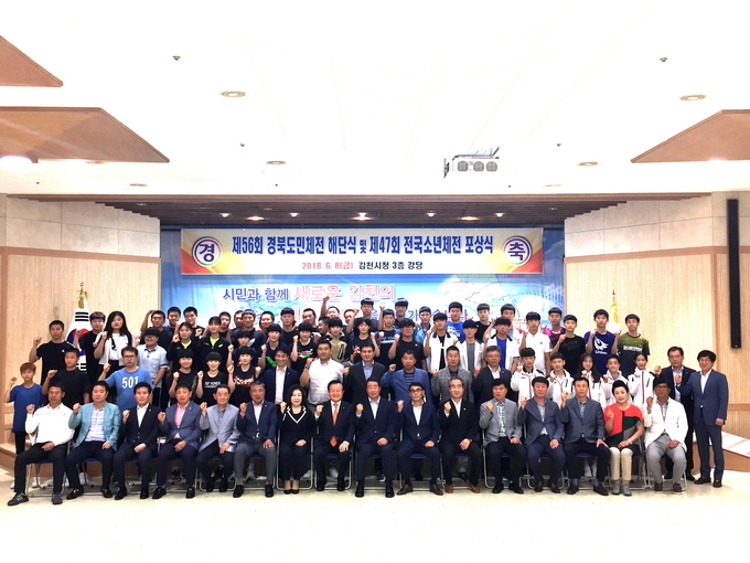 『제56회 경북도민체육대회 해단식 및 제47회 전국소년체전 포상식』이 6월 8일 시청 3층 강당에서 박보생 김천시장, 신정숙 김천교육지원청 교육장, 이춘근 김천시체육회 상임부회장, 최한동 종목별단체협의회장을 비롯한 경기연맹 회장 등이 참석한 가운데 열렸다.