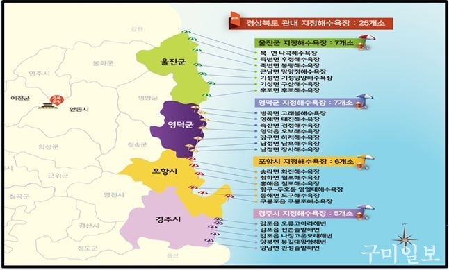 한편, 경북 도내 해수욕장은 포항시 6개 해수욕장이 오는 23일 개장하는데 이어 경주시·영덕군·울진군 등 3개 시군 19개 해수욕장은 내달 13일(단, 울진 구산해수욕장은 7월 7일 개장) 개장, 8월 15일 ~ 19일 중에 폐장한다.