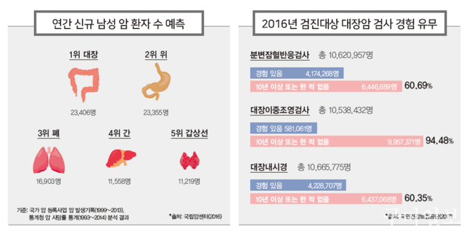그리고 2016년, 국립암센터 연구진이 국가 암 등록사업의 1999~2013년 암 발생기록과 통계청의 1993~2014년 암 사망률 통계를 분석한 결과 기존의 사망률 순위가 바뀔 것이라는 전망도 나왔다. 2016년 남성 대장암 신규 환자 예측치는 2만 3,406명으로, 남성 위암 신규 환자 수(2만 3,355명)를 근소한 차이로 앞설 것으로 예상된 것이다. 여성 대장암 신규 환자 예측치는 1만 4,562명으로 3위, 위암은 1만 976명으로 4위로, 여성에서는 이미 대장암이 위암을 상당한 격차로 앞선 것으로 나타났다.