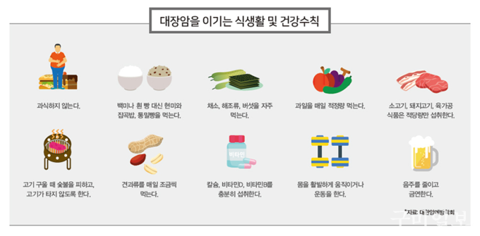 대장암 예방에 도움을 줄 수 있는 전곡 (밀, 쌀, 귀리, 옥수수 등), 과일, 채소 등의 식이섬유와 생선 등의 섭취를 권장하며, 대장암을 유발할 수 있는 소고기, 돼지고기 등의 육류와 햄, 소시지, 베이컨 등의 가공육 섭취는 자제하고, 술과 담배 역시 대장암 발생 위험을 높이므로 끊는 것이 좋다. 하지만 이런 생활습관 및 식이습관 개선만으로 대장암이 완전히 예방되는 것은 아니므로, 국가암검진 프로그램의 분변잠혈반응검사 혹은 대장내시경 검진을 주기적으로 받는 것이 필요하다.