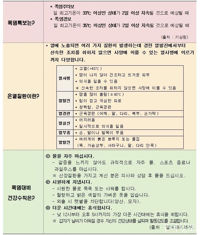 아울러, 폭염으로 인한 건강피해는 건강수칙을 지키는 것만으로도 예방이 가능한 만큼 물 자주 마시기, 더운 시간대 휴식하기 등 건강수칙 준수를 강조했다.