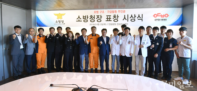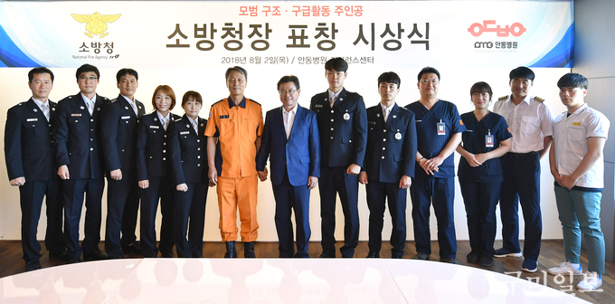 조종묵 소방청장은 8월 2일(목) 오후 3시 안동병원 컨벤션홀에서 김철중(상주소방서) 등 소방공무원 7명과 구조활동을 함께 도운 방준엽(울진고등학교), 닥터헬기를 이용 신속하게 환자를 이송한 이성훈(안동병원 응급의학과장)을 비롯한 병원관계자 4명에게 표창을 직접 수여했다.
