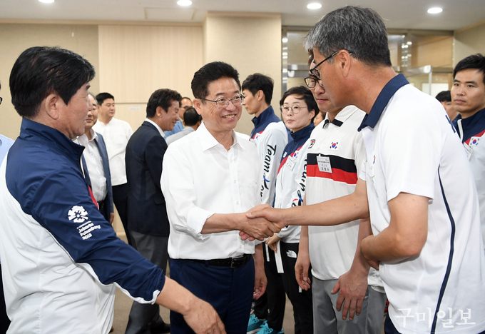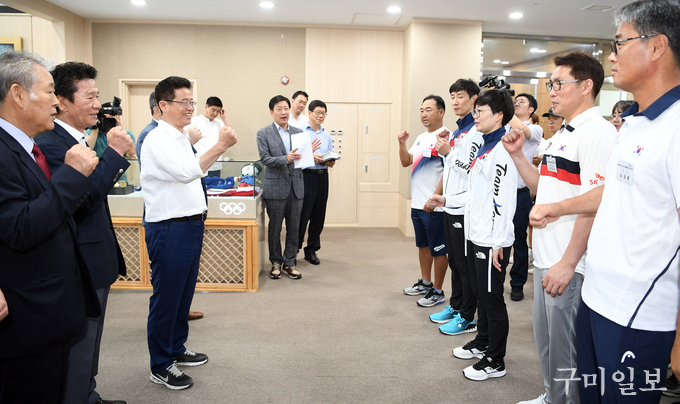 이철우 경상북도지사는 8월 8일(수) 충북 진천 선수촌을 방문해 오는 8월 18일(토)부터 열리는 ‘2018 자카르타-팔렘방 아시안게임’에 출전하는 경북출신(소속) 선수단을 격려했다.