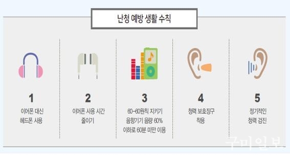 개인에 따라 다르나 일반적으로 85dB 이상의 소음은 난청을 유발하기 때문에 소음이 큰 환경에서는 귀마개를 착용하는 것이 좋다. 이어폰을 사용하는 경우 최대 음량의 60% 볼륨으로 하루에 60분 정도만 사용하는 ‘60-60 법칙’을 지킬 것을 권유한다. 또한 30분 정도 이어폰을 사용하면 10분은 쉬는 것이 좋다. 특히 지하철이나 버스 등 배경 소음이 큰 곳에서 이어폰을 사용하면 주변소음보다 더 큰소리로 듣는 경우가 많아 주의해야 한다.