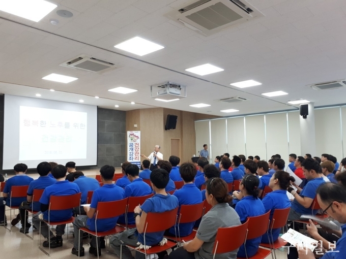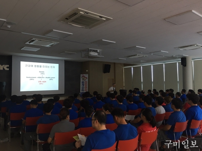 한국건강관리협회 경북지부(이하 건협 경북지부, 본부장 이영하)는 지난 8월 22일(수) 국민건강보험공단 경산·청도지사와 함께 (주)DYC 직원들을 대상으로 정태훈 진료과장(호흡기내과 전문의)이 ‘대사증후군 예방’에 관한 건강강좌를 실시하였다.