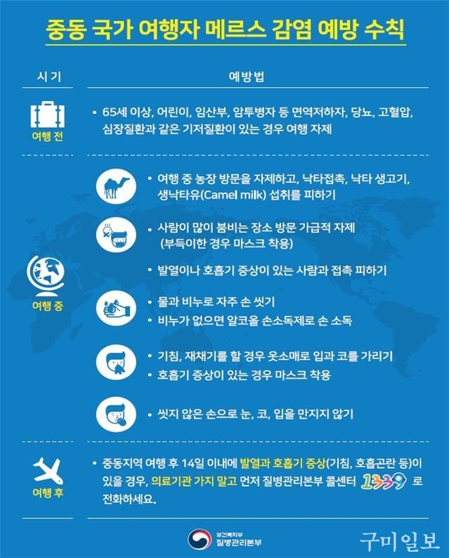 메르스는 낙타접촉, 낙타유 섭취, 또는 메르스 환자와의 직‧간접 접촉, 비말을 통해 감염되는 것으로 알려져 있다. 따라서 중동지역 여행 시 낙타 접촉 및 낙타 부산물(낙타고기, 낙타유) 섭취를 피하고, 손씻기 등 개인위생수칙을 준수하여야 한다.