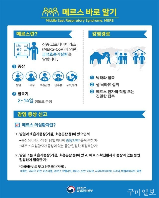 보건소 관계자는 중동지역 여행 후 14일 이내에 증상(발열과 기침, 가래 등 호흡기 증상, 설사나 구토 등 소화기 증상, 근육통 등)이 있을 때는 의료기관을 바로 방문하지 말고 질병관리본부 콜센터(1339) 또는 보건소(☎감염병관리계 : 421-2715)로 신고하고, 아울러 의료기관 종사자에게도 의심되는 환자 발견 시 보건소에 즉시 신고할 것을 당부하였다.