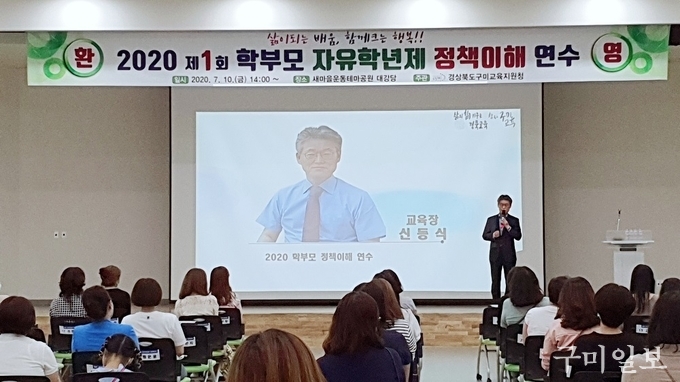 구미교육지원청(교육장 신동식)은 2020년 7월 10일(금) 오후 2시 새마을운동테마공원 글로벌관 다목적홀에서 초등학교 5, 6학년 학부모 100여 명을 대상으로 “자유학년제 정책이해 연수회”를 개최하였다. 이번 연수는 코로나-19로 인하여 ‘생활 속 거리두기’를 이행하면서 실시하는 관계로 최소 인원의 학부모를 대상으로 진행하였다.